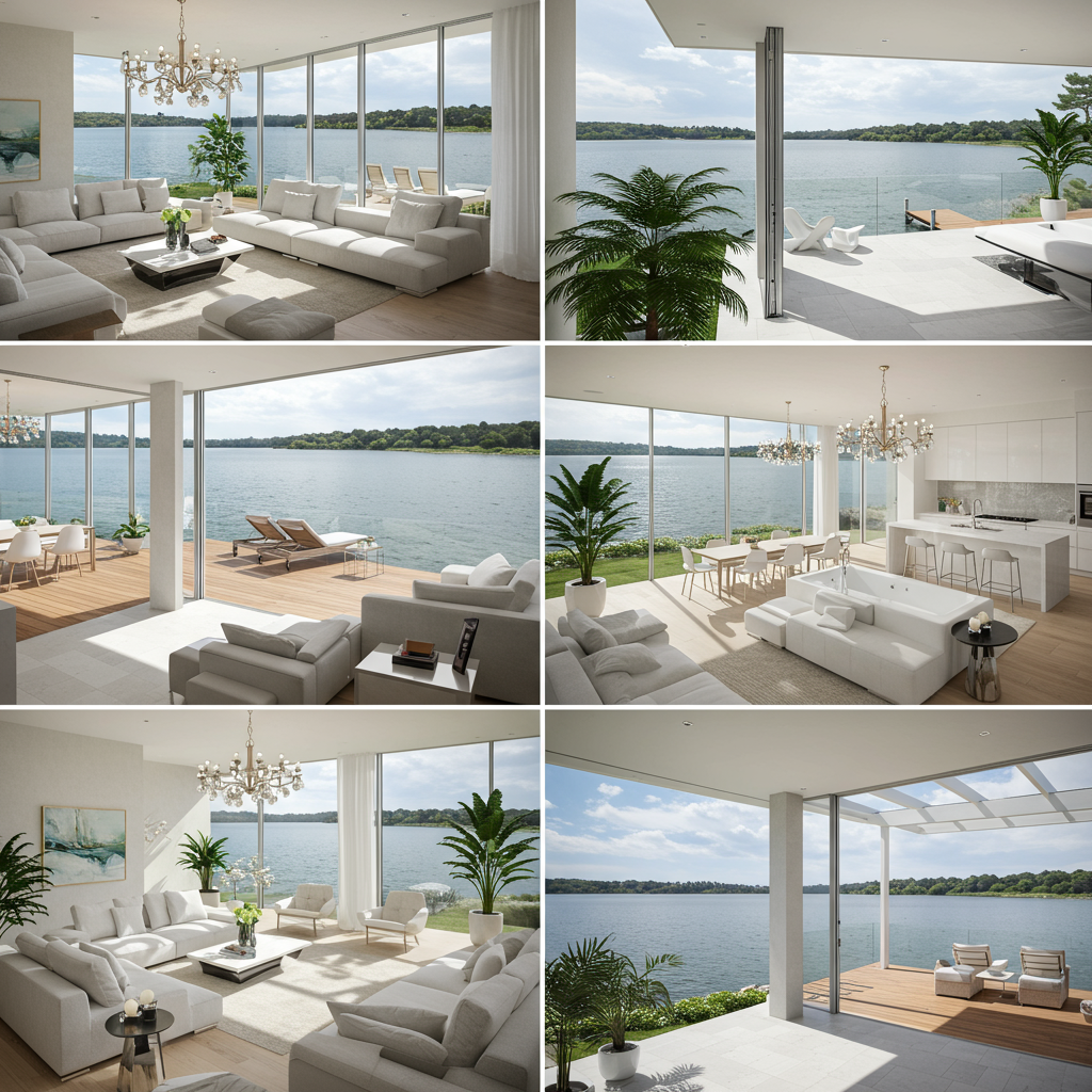 The lower level holds two additional bedrooms and hall bath. There are separate areas for entertaining, a media area, and even a wall of cabinetry with wine fridge and wet bar area. All leading out to the rear covered sitting area and waterfront.