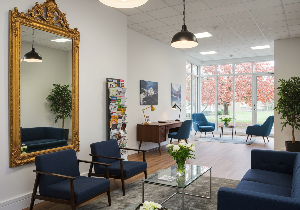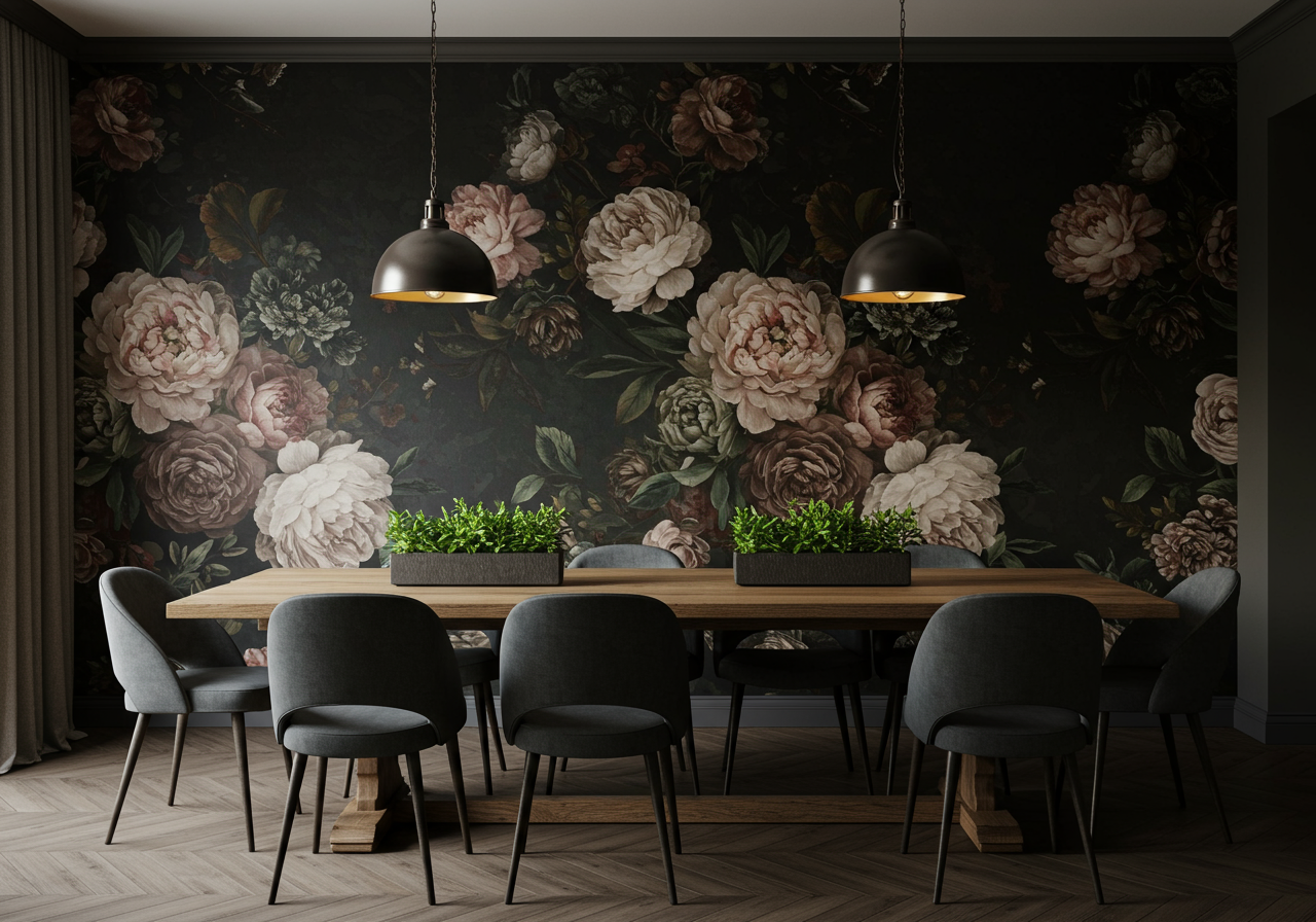 This isn’t a typical office space, bold pieces like the ornate gold mirror and the unique floral wallpaper make the space come to life. Velvet furniture, transparent tables, dark stained wood & a living wall with real moss are also notable features of the second office location.